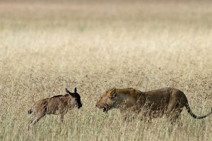 There is something truly remarkable about the mass calving of wildebeest between late January and early March. Within a matter of weeks, most female wildebeest drop their calves in a synchronized birthing that sees the Serengeti’s southern plains filled with over 400 000 young. Estimates are that 8 000 wildebeest are born a day – that is 300 every hour! While lion, leopard, cheetah, hyena and wild dog certainly eat their fill of these gangly baby gnus, the synchronized calving is an effective survival mechanism for the species: there is simply too much food for the predators to consume.